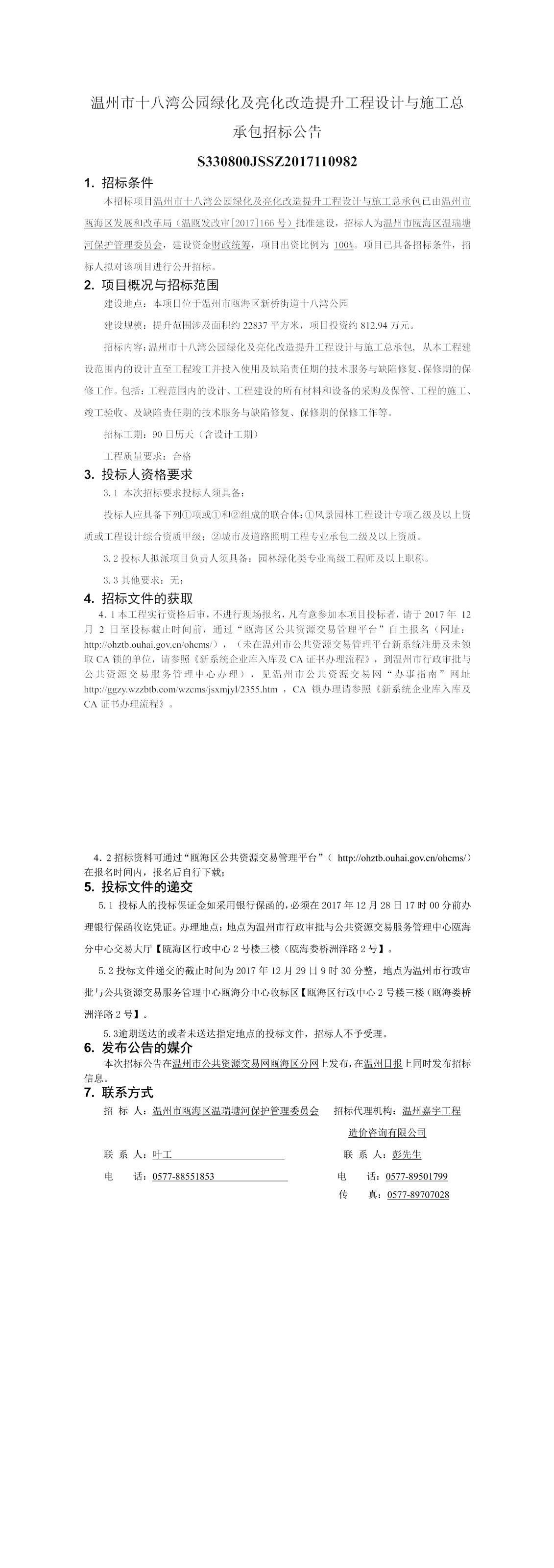 温州市十八湾公园绿化及亮化改造提升工程设计与施工总承包